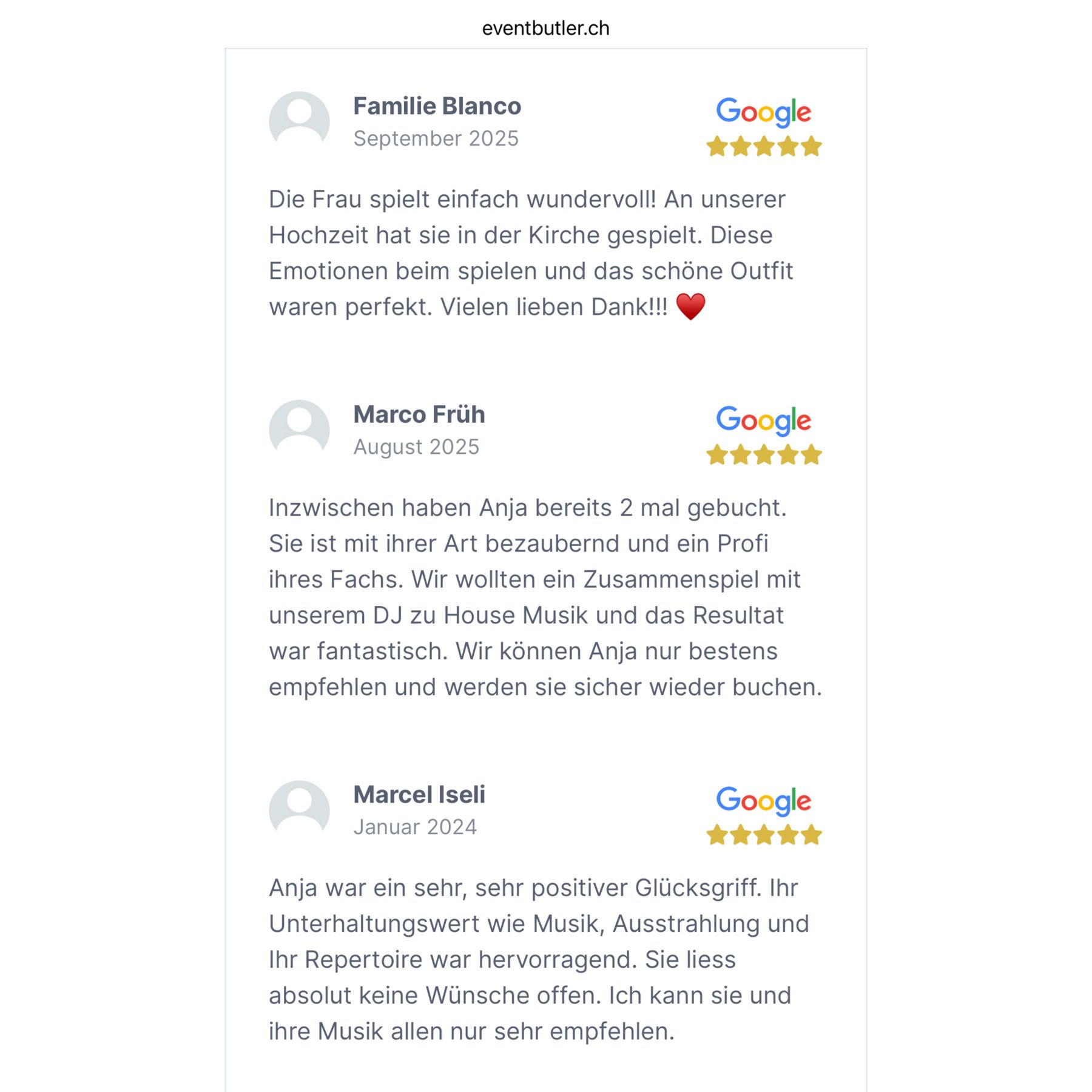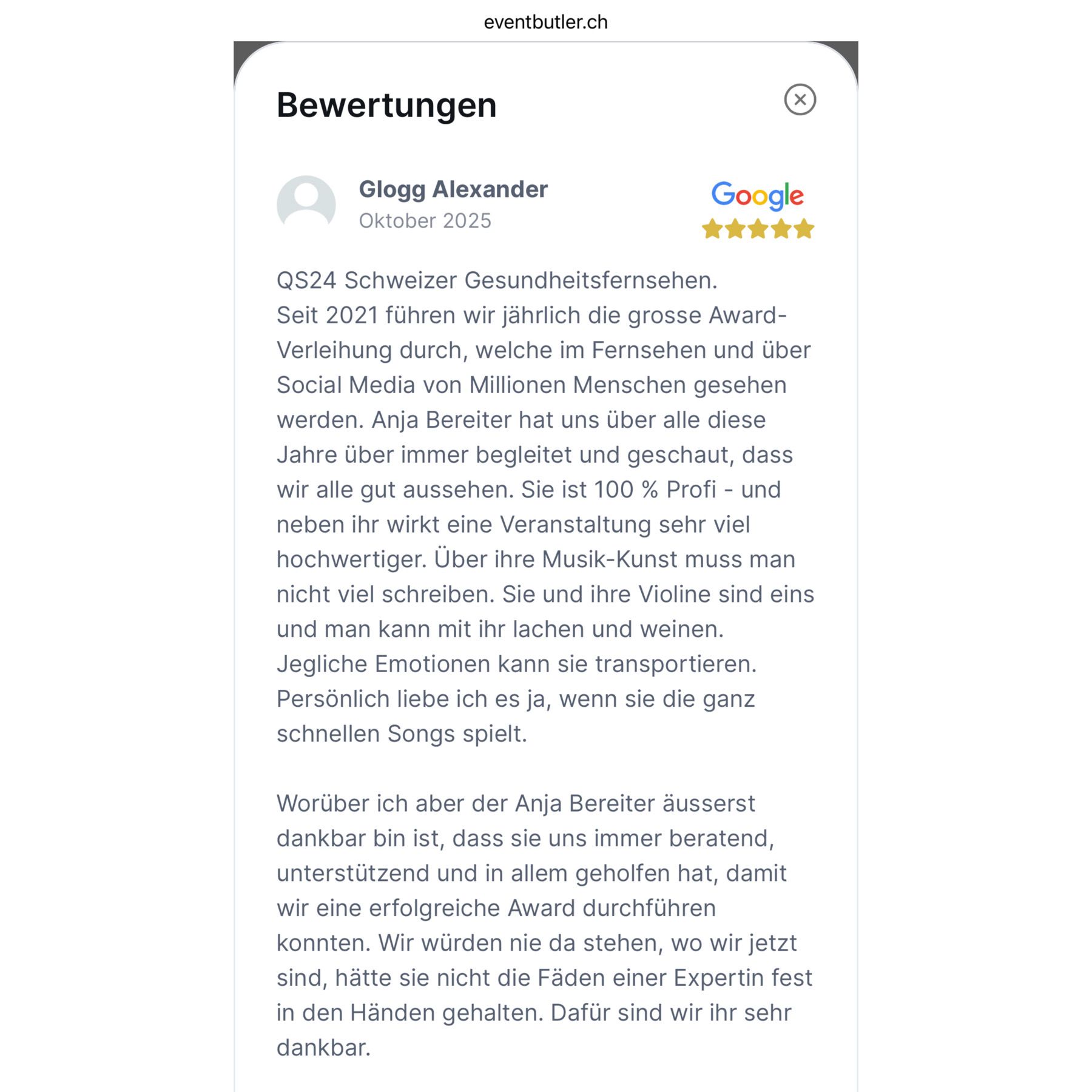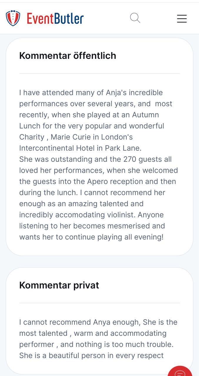 Externe Bewertungen für Anja Bereiter, Violinistin - https://www.eventbutler.ch/de/geigerin-violin-show-eventmusik-violinistin-e-violinistin